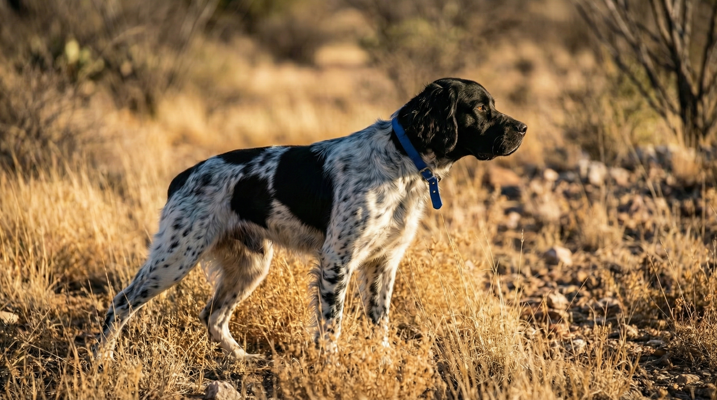 Tux splits his time between Montana and Arizona, hunting in two completely different environments throughout the year. In Montana, he works the tall grass prairies from late spring through early fall. In Arizona's desert landscape during the late fall and winter months, he adapts to different cover, different bird species, and different conditions. He also spends time training in late winter to early spring in Kansas and Georgia.